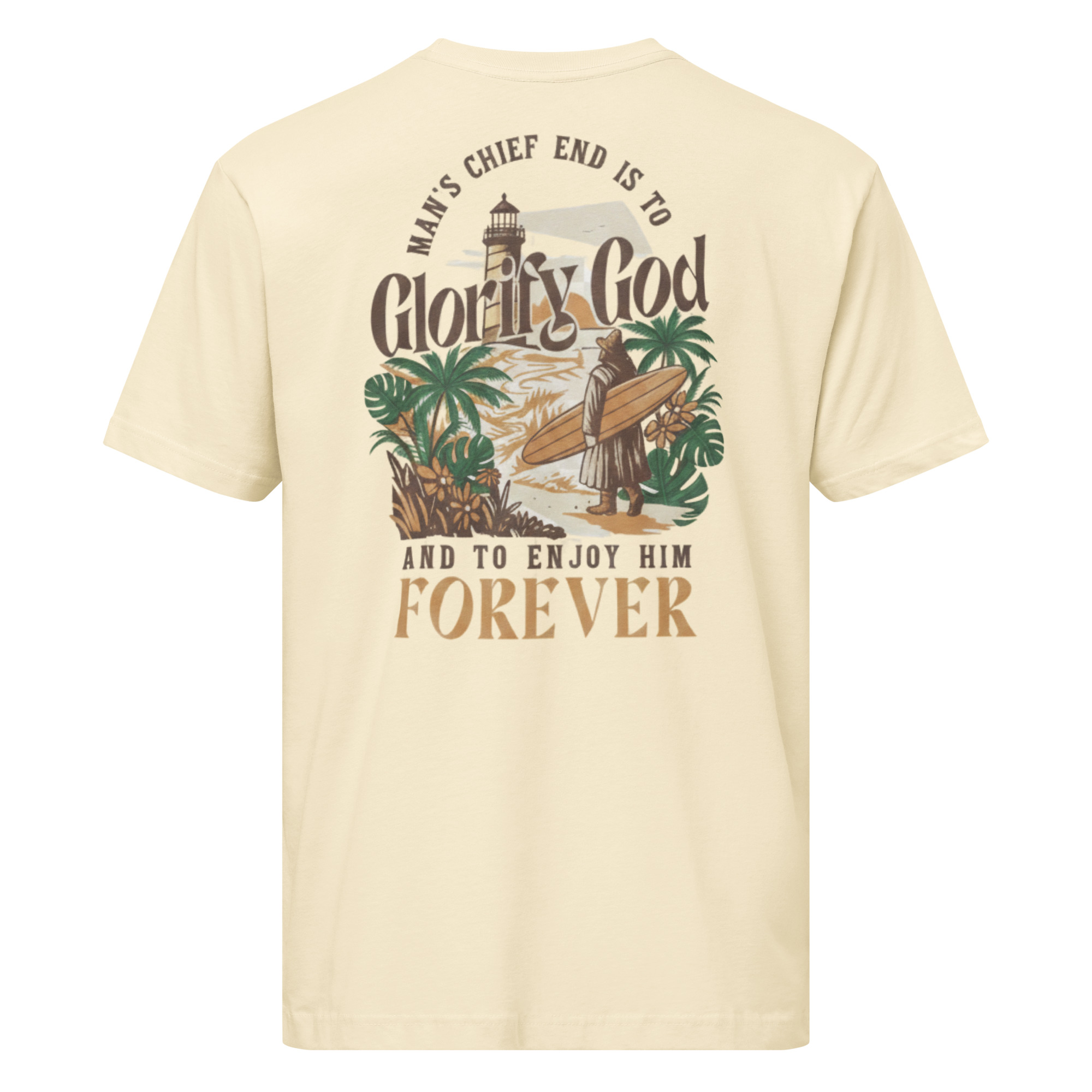 Man’s chief end is to glorify God, and to enjoy him forever.” This classic truth from the Westminster Shorter Catechism gets a fresh, coastal update. Featuring a vintage-inspired illustration of a surfer approaching a lighthouse, this tee is designed for those who find the glory of God in the crashing waves and the steady light of truth.